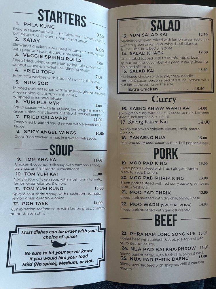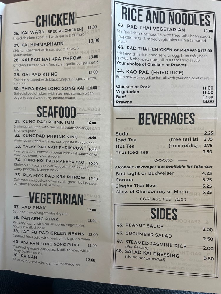 The soup offerings are equally enticing, showcasing the rich flavors of Thailand. The Tom Yum Kung, a spicy shrimp soup, and Tom Kha Kai, a warming chicken dish with coconut milk, are standout choices. Don't miss the famous Salad Kai, a vibrant combination of marinated chicken and fresh produce that exemplifies the restaurant's dedication to quality ingredients.